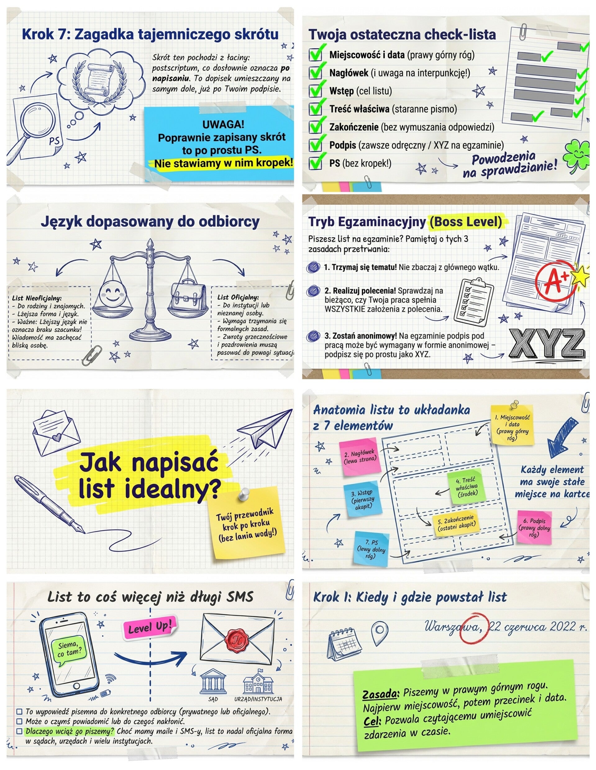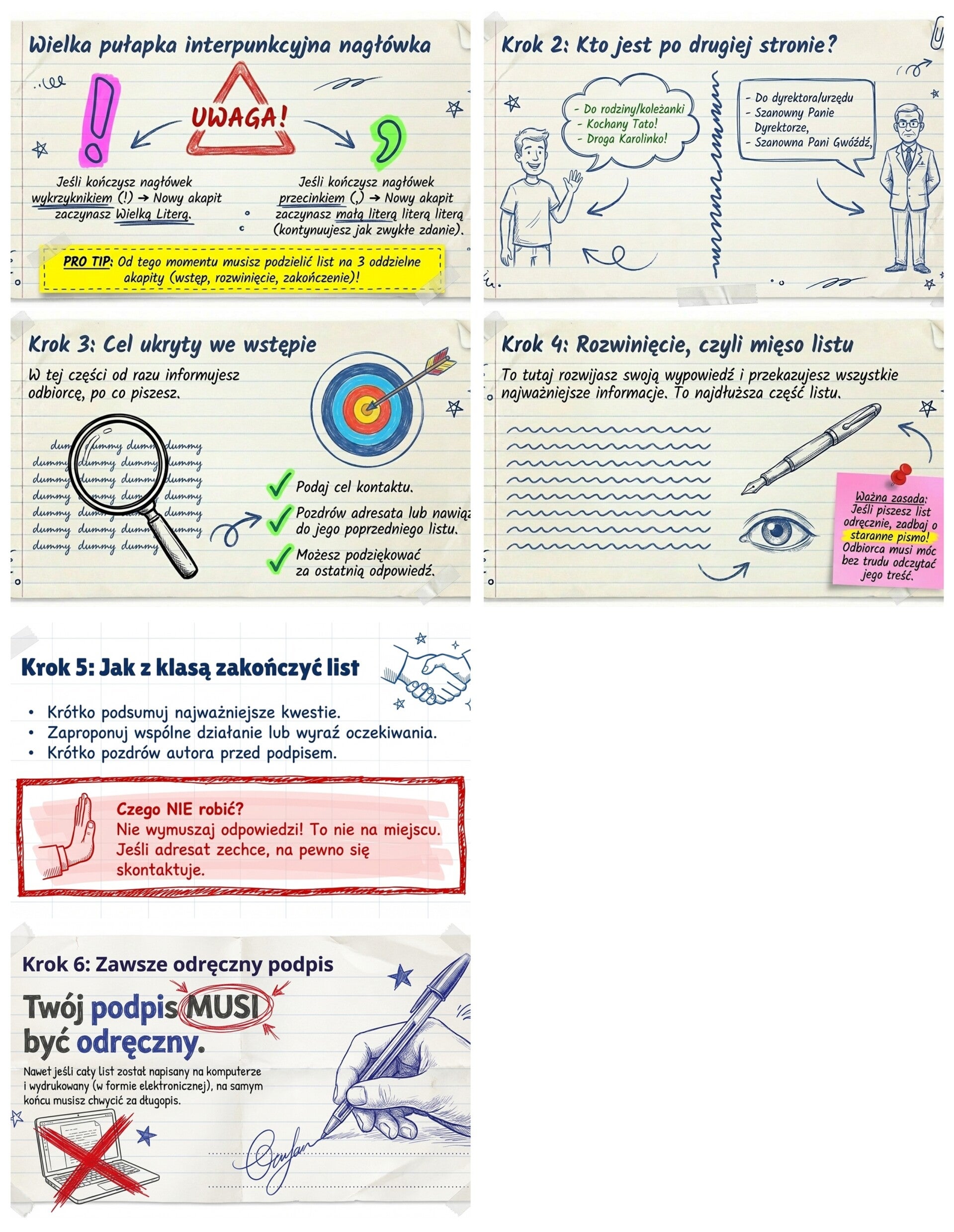 „Jak napisać list idealny?” to wizualny przewodnik krok po kroku, który przedstawia wszystkie elementy listu w sposób zrozumiały dla uczniów. Dzięki ilustracjom, schematom i krótkim wskazówkom uczniowie szybciej przyswajają zasady i łatwiej zapamiętują strukturę wypowiedzi.